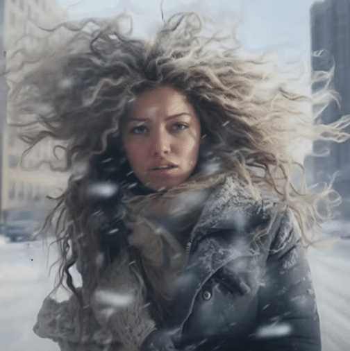 This woman stands in the heart of a brutal Midwestern winter, her hair wild with wind and snow swirling around her like static. Her layered coat and scarf hint at survival, not just comfort—she’s clearly no stranger to the icy grip of an Illinois blizzard.