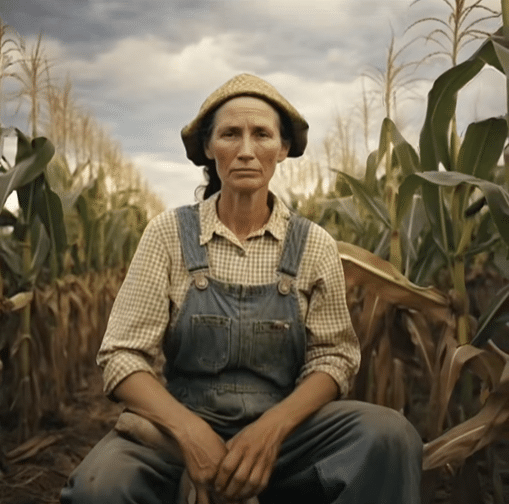 Sitting in the middle of a cornfield under a heavy sky, this woman is the image of Indiana’s agricultural roots. Her overalls, work-worn hands, and sun-aged skin show a life of labor, perseverance, and deep connection to the land.