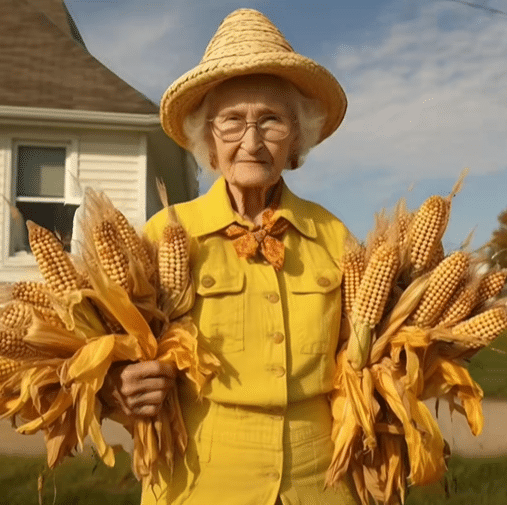 With a stoic expression and dressed in golden hues to match her harvest, this woman holds bundles of corn like treasured trophies. Her bright yellow outfit, vintage scarf, and sun hat shows her middle American charm—an ode to Iowa’s rich farming legacy and strong community spirit.