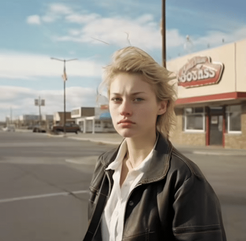 Standing on a calm street with a windswept hairstyle and a worn leather jacket, this woman epitomizes the no-frills mood of small-town Nebraska. The flat horizon, wide roads, and simple signage around her show a landscape where life moves at its own steady pace.