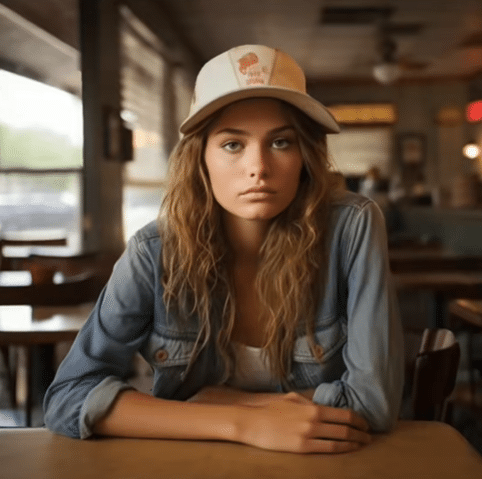 Sitting in a weathered diner with sunlight spilling through the blinds, this woman just says Texas without even trying. Her worn denim jacket, trucker hat, and calm intensity feel like home on the range—where things move slow, but the pride runs deep.