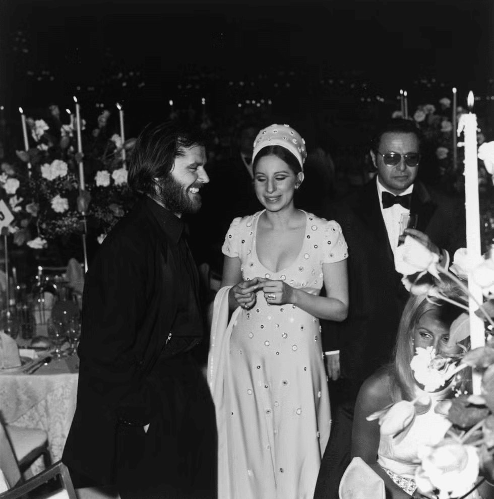 In this glowing moment from 1970, Jack Nicholson, bearded and beaming, shares a laugh with Barbra Streisand at an Academy Awards party. Jack had just earned his first Oscar nomination for Easy Rider, and his excitement is written all over his face.