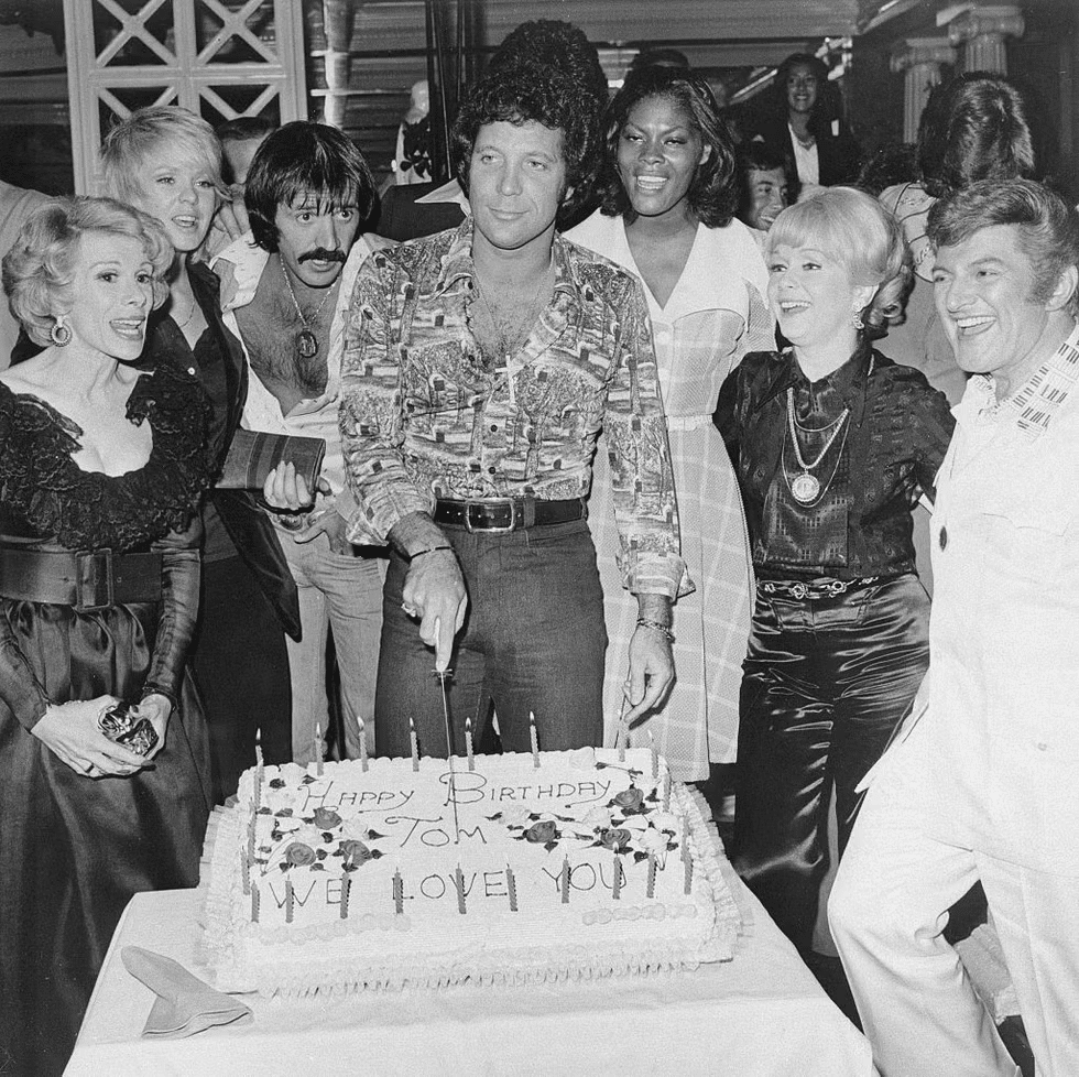 Tom Jones rang in his 34th birthday in true Vegas fashion—flanked by some of the biggest stars of the era and slicing into a massive cake at Caesars Palace. The guest list was a who’s who of glam: Joan Rivers with her sharp wit, Sonny Bono sporting a mustache and open shirt, Dionne Warwick glowing in white, Debbie Reynolds looking chic as ever, and Liberace beaming in all white.