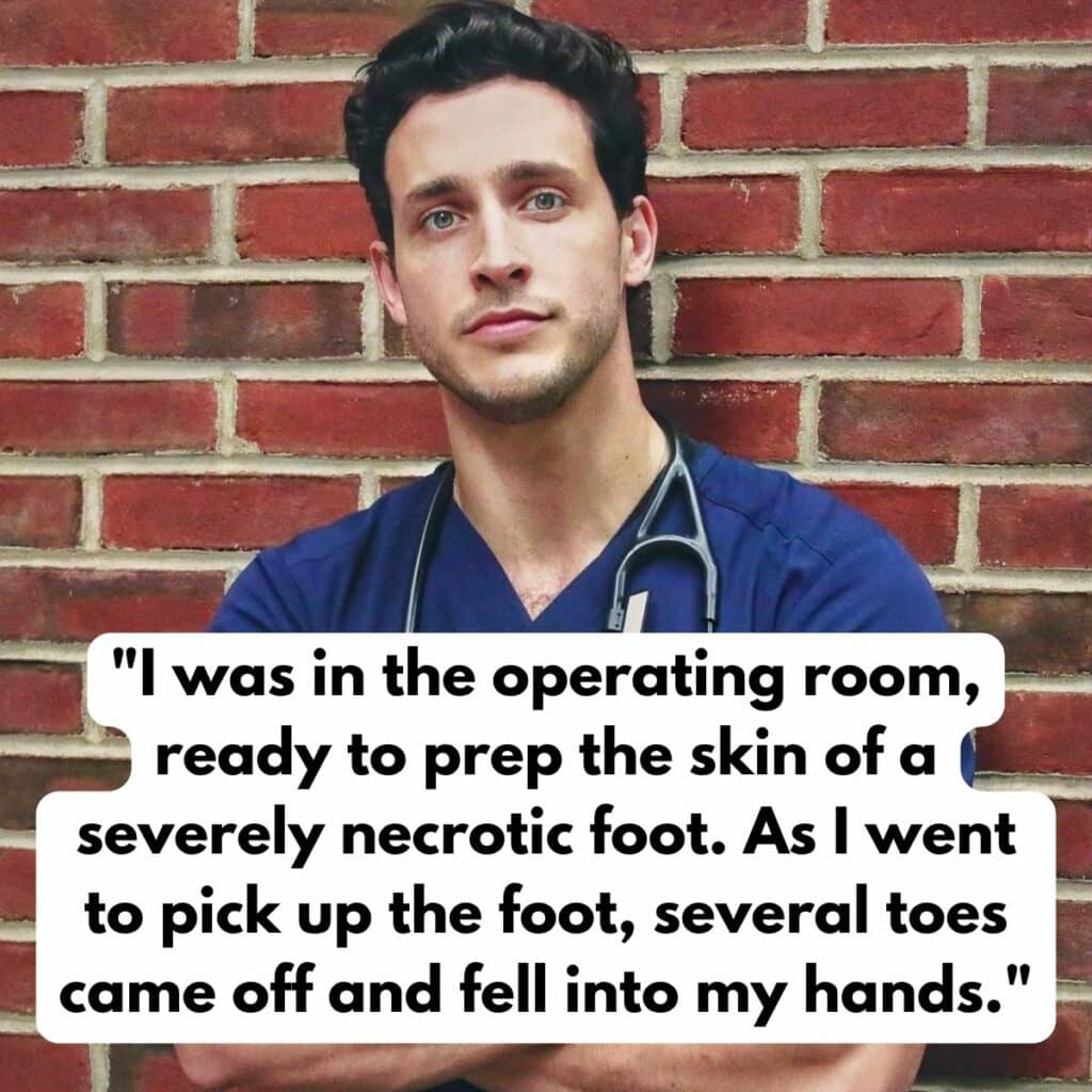 The healthcare industry is not for the faint of heart. There are a lot of situations where doctors, nurses, surgeons, and other professionals have to deal with the dark and dirty parts of humanity. This person works in operating rooms and has seen plenty of weird, gross things in her lifetime. The most memorable instance was when she was prepping a necrotic foot for an operation.