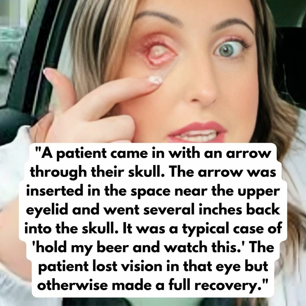 Thankfully, the arrow did not hit his brain. If it did, this would have been a completely different type of story. Our storyteller was able to save this guy’s life, although he lost vision in one eye. So, how did the arrow end up in his eye? He and his buddies were drinking, and he took the challenge on as a dare.