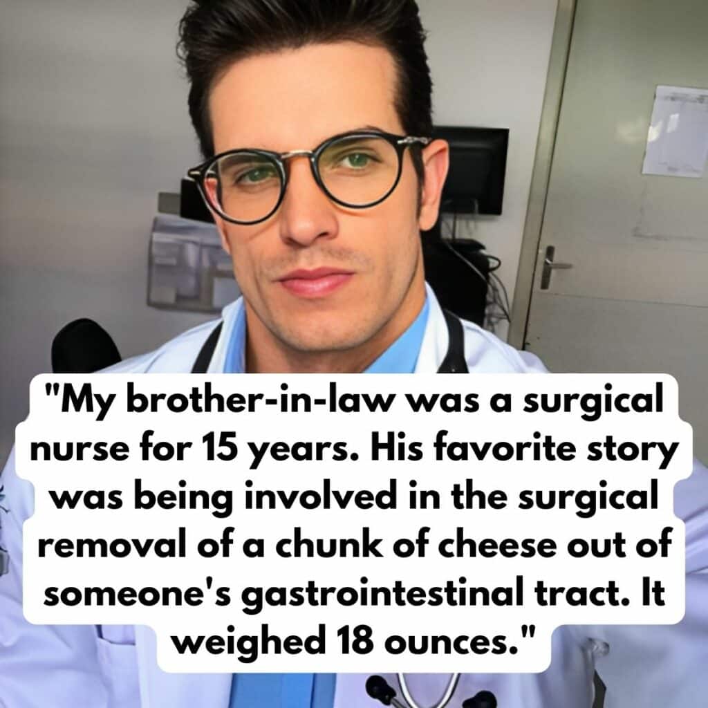 This person’s brother-in-law has some truly wild stories from his time working as a surgical nurse. He worked the same job for 15 years, so he has an arsenal of hilarious, tragic, and jaw-dropping tales. His favorite one to tell is the time he surgically removed a huge chunk of cheese from someone’s intestines.