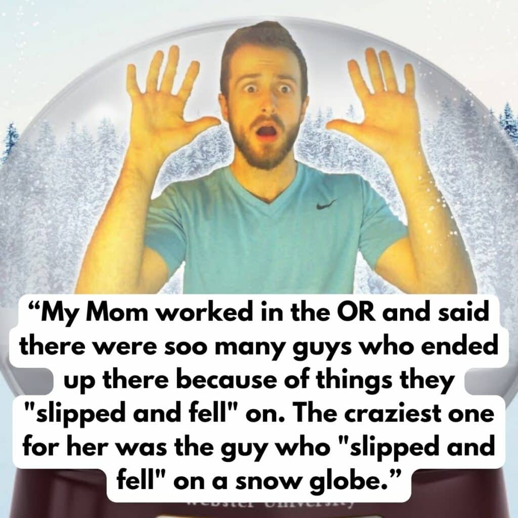 When you work in a hospital for any extended period of time, you start to notice patterns. This person’s mom worked in an ER operating room and noticed an odd phenomenon among many of the male patients who came in for emergency procedures. More than a few men would come in because they “slipped and fell” on the weirdest household objects.