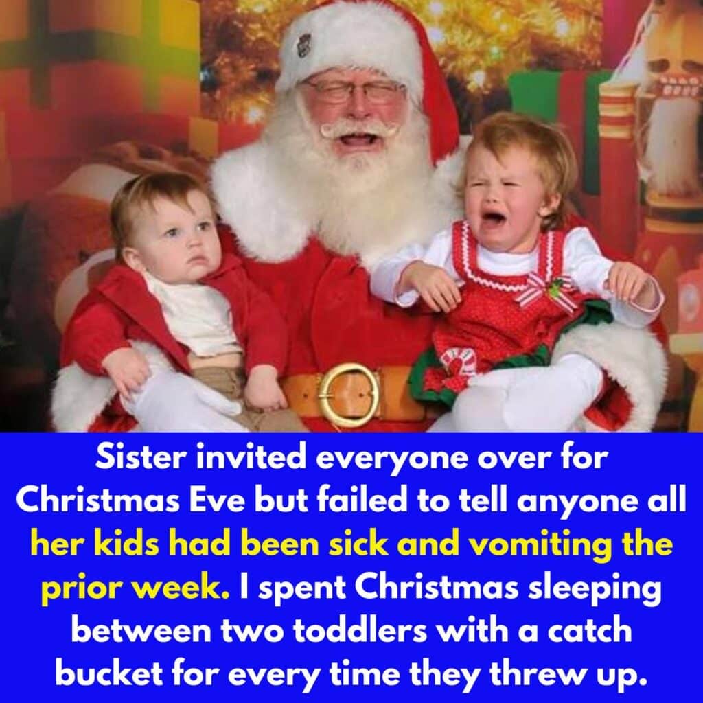 Amidst the festive decor, this lucky sibling found themselves in a new role. Positioned between two toddlers, each clutching their own ‘puke bucket,’ the night transformed from merry-making to gentle caregiving. As each tot took turns playing ‘pass the puke,’ the true spirit of the family – chaotic, unexpected, but ultimately united – shone through in these less-than-ideal circumstances.